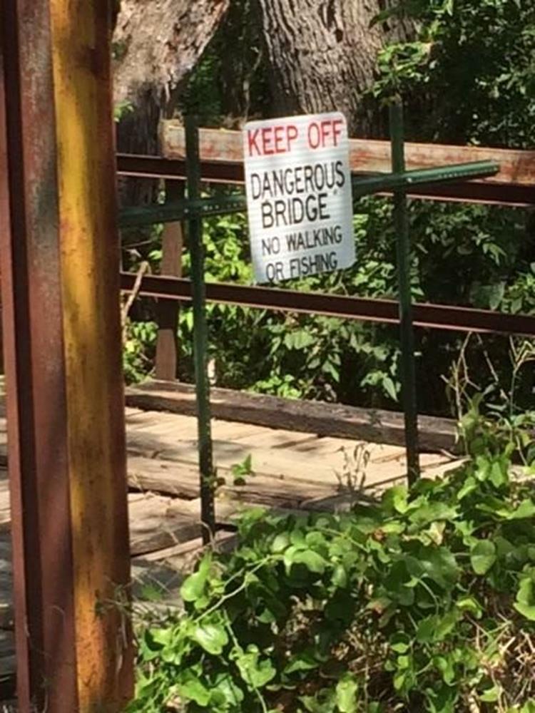 The central Texas area experienced two major flood events in 2015, both of which caused damage to the decking of the bridge. LCRA data recorded rainfall amounts in the area as ranging between approximately 5.5 and 6.7 in. during one 24-hour period, and the Colorado River at Bastrop was 3 feet above flood stage (Chavez 2015). Wilbarger Creek, which usually flows approximately 30 feet below the decking of the bridge, went out of its banks and overflowed the bridge. The flood crest on Wilbarger Creek at Elgin of 37.83 feet on May 26 is considered to be an ‘historic crest’ (National Weather Service 2016). As the water receded, the damage to the bridge decking became apparent. To provide a basis for comparison, Fig. 1 and Fig. 2 show the condition of the bridge decking in January 2015, and Fig. 3, Fig. 4, and Fig. 5, show the condition of the bridge decking after the May 2015 flood. After the flood, the bridge was closed to pedestrian traffic because of safety concerns (Fig. 6).
