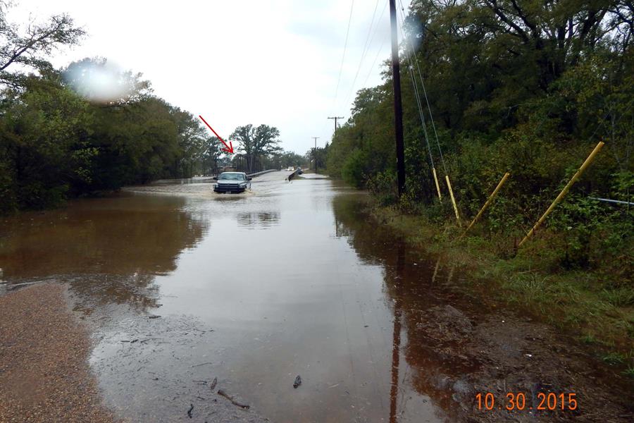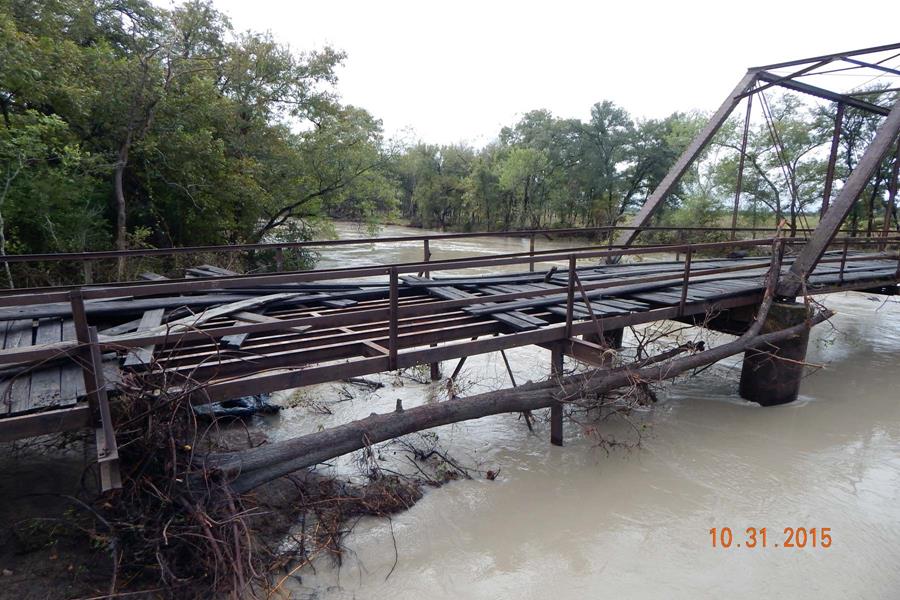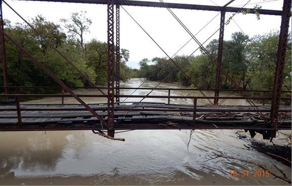 Before the October wildfire was completely extinguished, the county experienced another significant rainfall event that was both a blessing and a curse: it was a blessing in that it completed the job of extinguishing the wildfire, but a curse in that it brought more flooding to the area. Like the May flood, the October flood also resulted in an historic crest on Wilbarger Creek at Elgin at 37.10 ft on October 31 (National Weather Service 2016); this crest was only 8¾ in. below the crest in May. Although the extent of the October flood would have been sufficient to damage the bridge decking, it exacerbated the damage from the May flood; some of the damaged decking from the May flood washed away in the October flood. Fig. 9 shows the flooding road on October 30, before the crest of the floodwaters on Wilbarger Creek. Fig. 10, Fig. 11, and Fig. 12 show Wilbarger Creek and the bridge on October 31; the receding floodwaters revealed the new damage to the decking.
