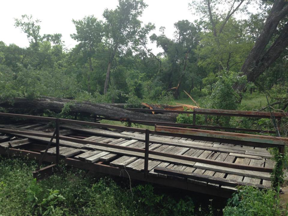 During the early morning hours of April 30, a storm packing straight-line winds of up to 75 mph blew through Bastrop County. The Lower Elgin Road bridge would probably have not sustained any damage from this storm, except that a tree was blown down on the bridge approach at the end furthest from the creek. The damage seems to have been confined to the approach, rather than to the main structure. Fig. 13, Fig. 14, Fig. 15, and Fig. 16 show this damage.