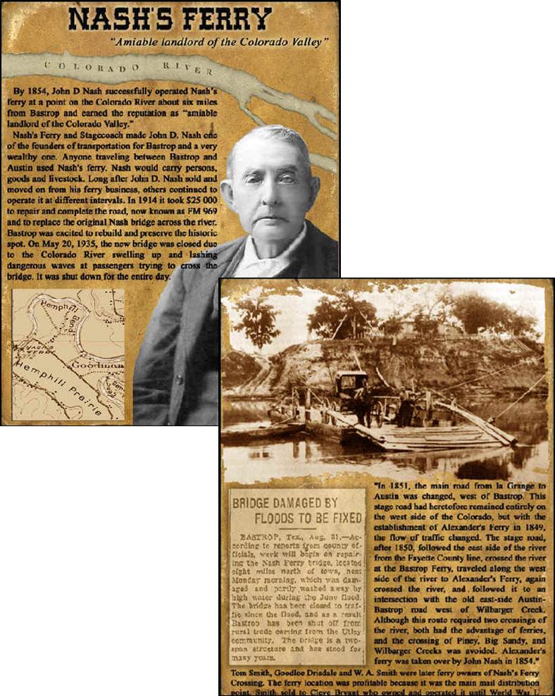 Before John Nash built his ferry business in 1854, the route to market for cotton crops was not very efficient. Cotton became a cash crop in Bastrop County around 1841; during this period, another cash commodity was Bastrop loblolly pine timber. Both products, however, were difficult to get to market. An interesting article by Mike Cox described an innovative solution for both: rafts were built from the pine timbers, then the cotton was floated down the Colorado River on these rafts to Matagorda. At Matagorda, the rafts were dismantled, and both the cotton and the pine were sold (Texas Escapes). Although this process could get both commodities to market, because of the meandering route of the Colorado River, it is a journey of approximately 300 miles.