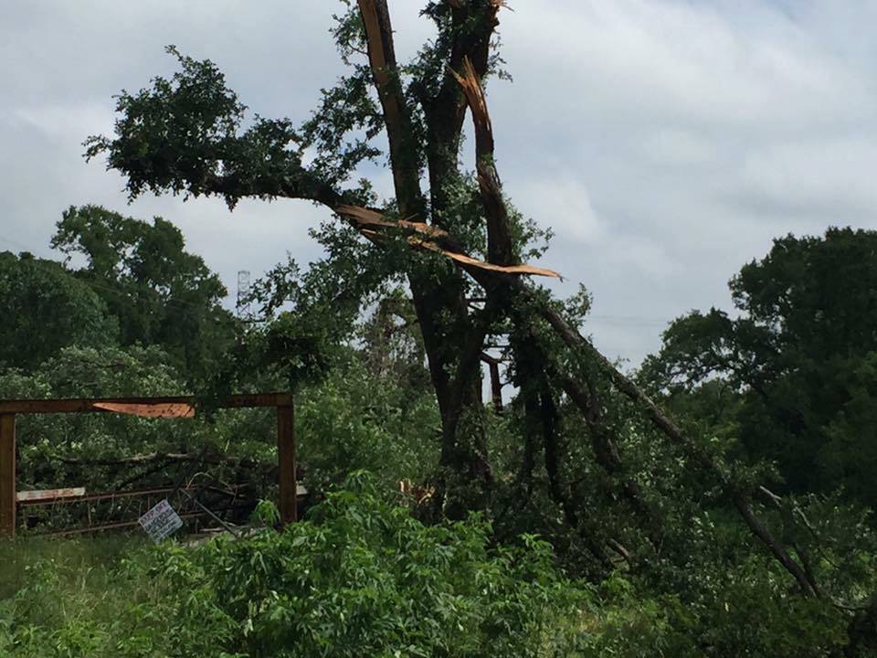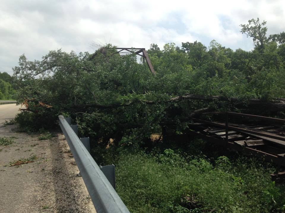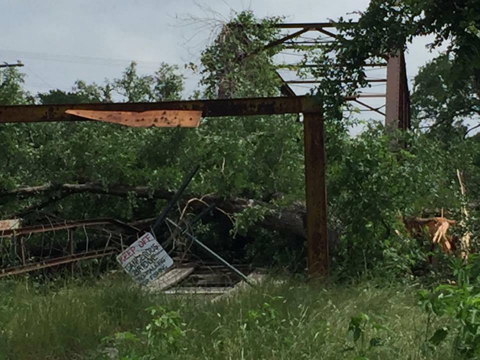 During the early morning hours of April 30, a storm packing straight-line winds of up to 75 mph blew through Bastrop County. The Lower Elgin Road bridge would probably have not sustained any damage from this storm, except that a tree was blown down on the bridge approach at the end furthest from the creek. The damage seems to have been confined to the approach, rather than to the main structure. Fig. 13, Fig. 14, Fig. 15, and Fig. 16 show this damage.
