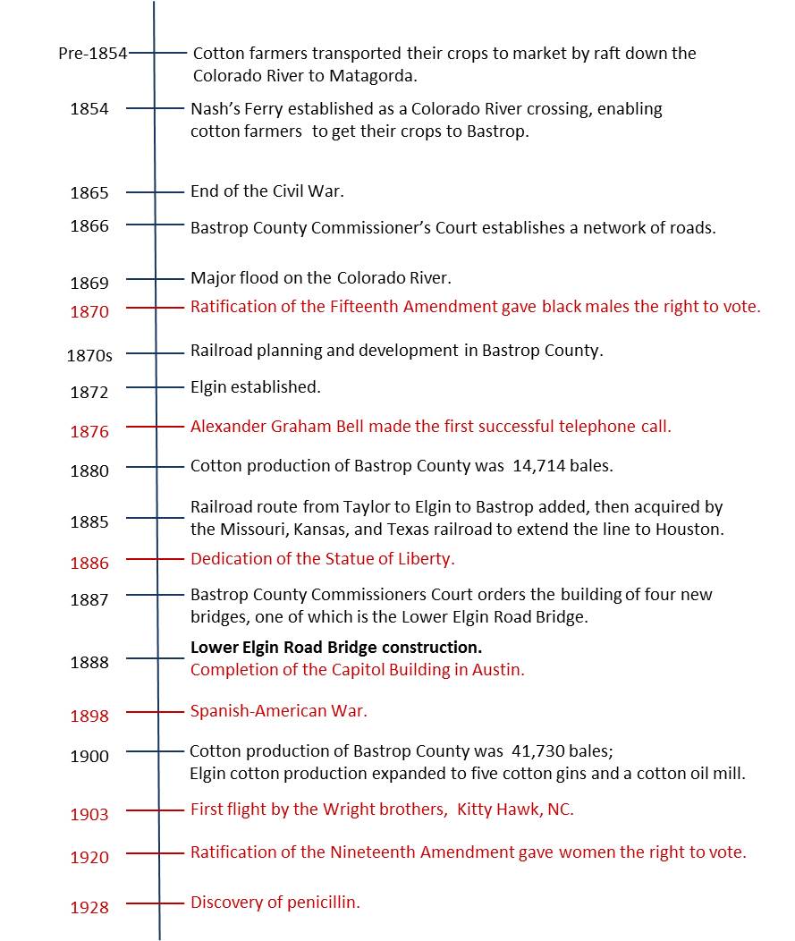 Information obtained from TxDOT specified that the purpose of the Lower Elgin Road bridge was to link the communities of Cedar Valley, Union Hill, and Utley with Elgin, but did not specify why it was important to link these communities. Subsequent historical research, however, indicates that the purpose of this linkage was to provide the farmers with a means of getting their crops to market and to expand the business, financial, and economic development of Elgin. Each topic included in the website provides additional information about the various facets of those goals.