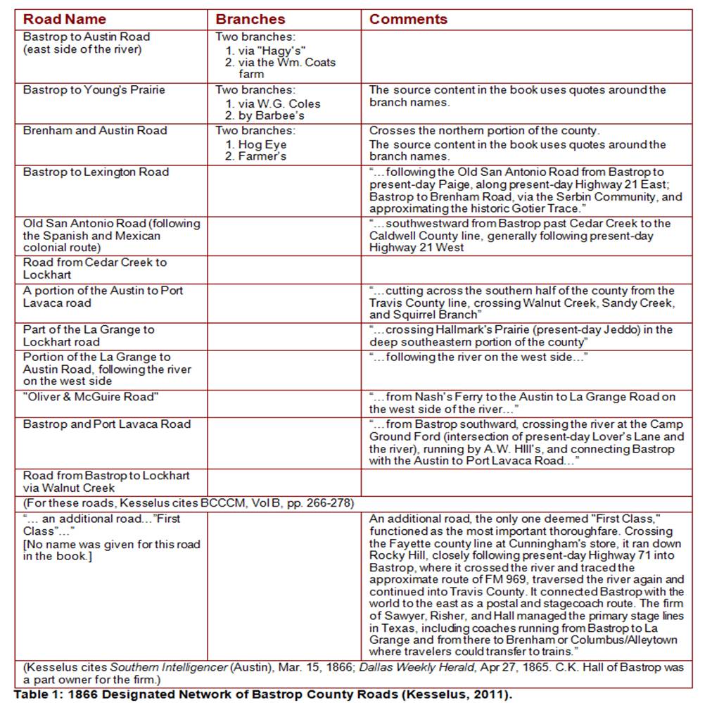 In January 1866, the Bastrop County Commissioners Court (BCCC) designated a system of roads within the county. Because there was no county funding available for either their construction or upkeep, the BCCC also specified that these roads would be the responsibility of the individuals whose property adjoined the designated roads. This early network of roads included 13 designated roads, as described in